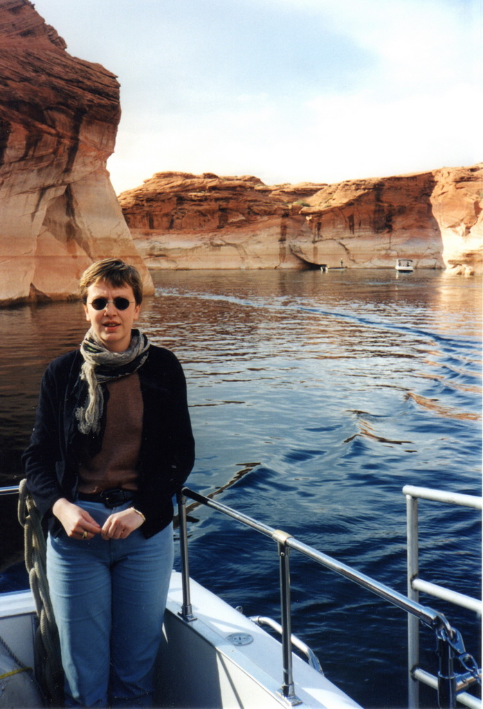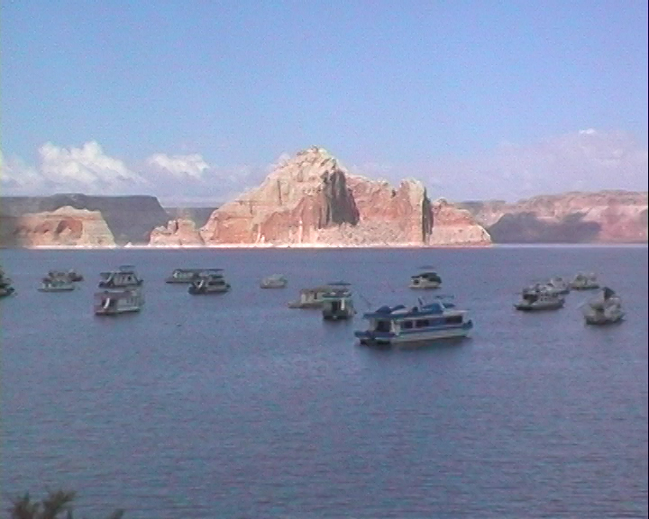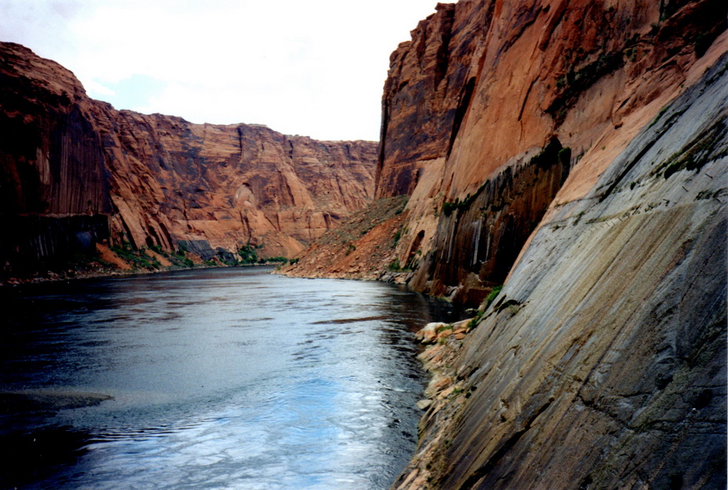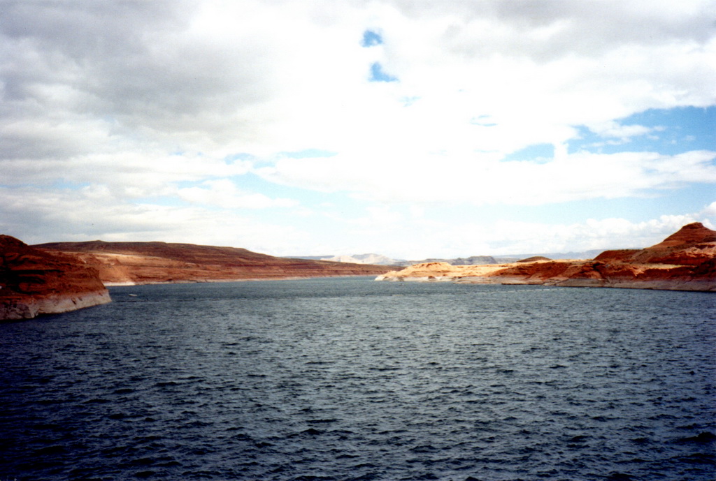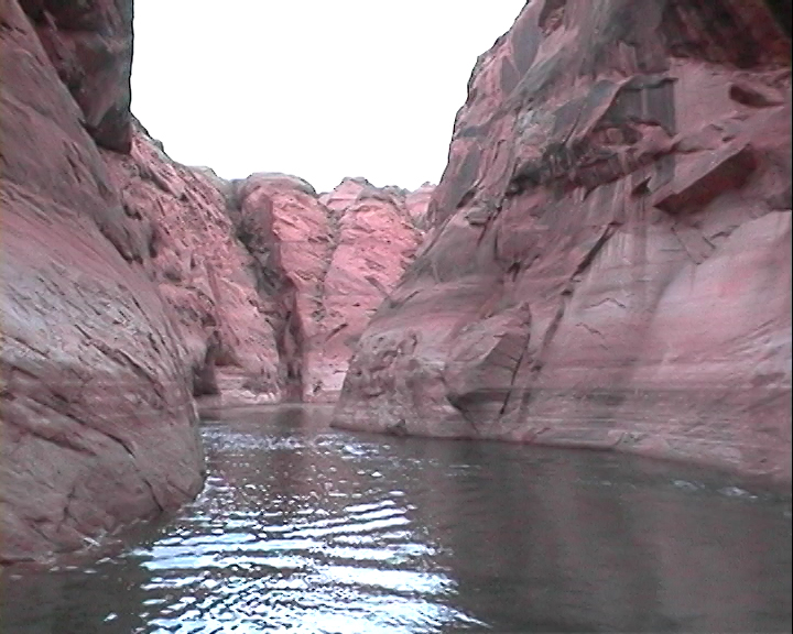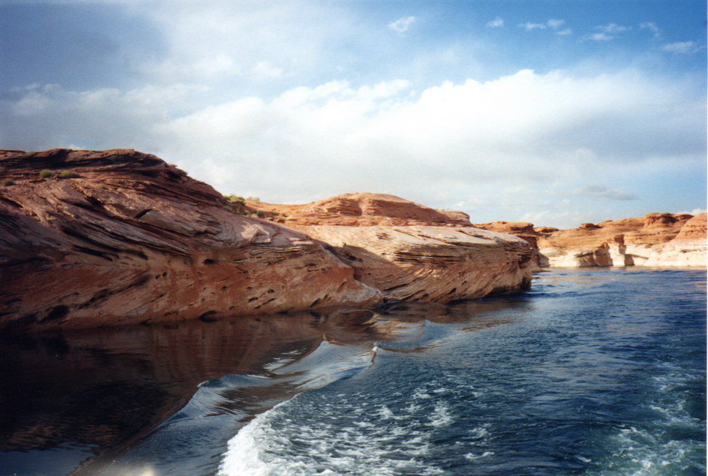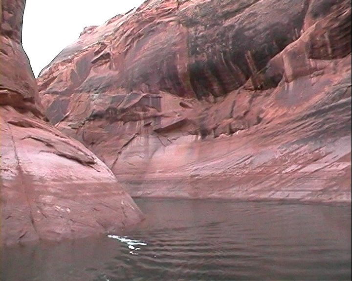 Après être passé près du barrage, notre bateau se dirige vers l'Antelope Canyon. C'est une sorte de bras formé par l'érosion et que le Colorado a comblé. Les falaises qui nous entourent sont impressionnantes, même si elles restent de dimensions reduites (environ 30 à 50 mètres de haut) comparées à celles situées dans d'autres bras du lac et qui, paraît-il, atteignent les 900 mètres.