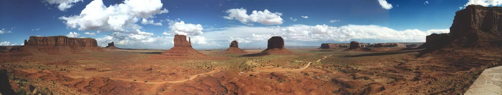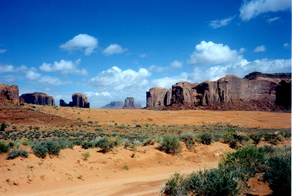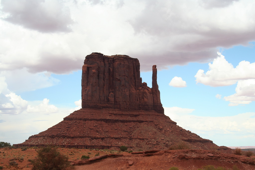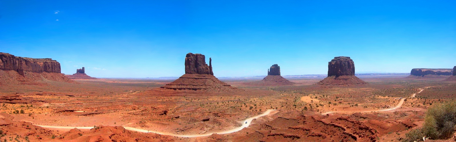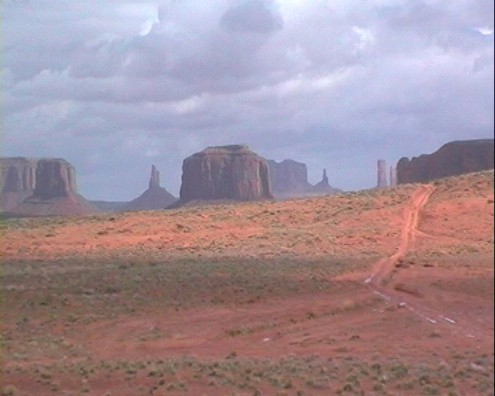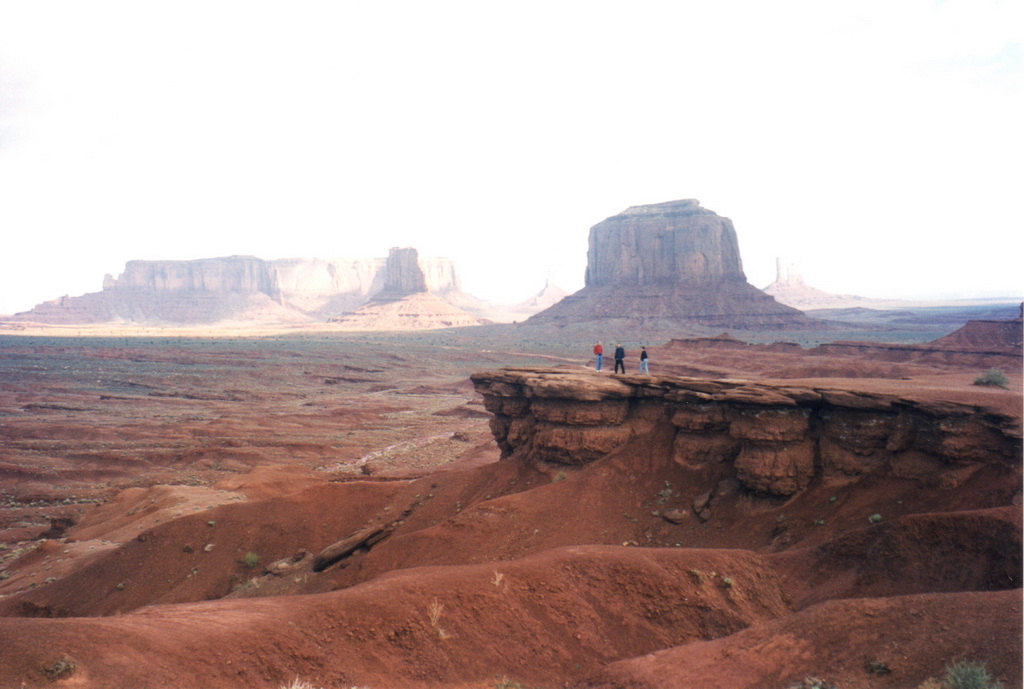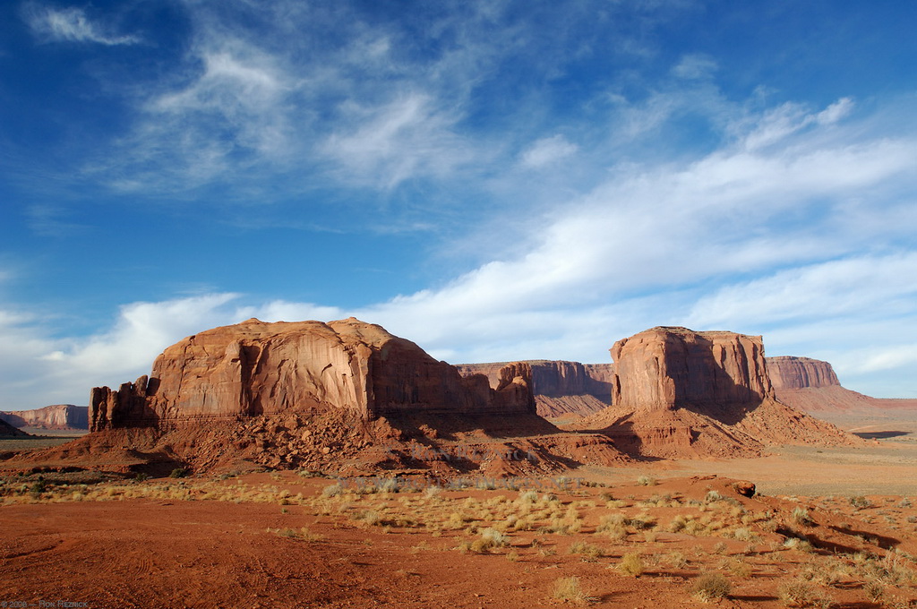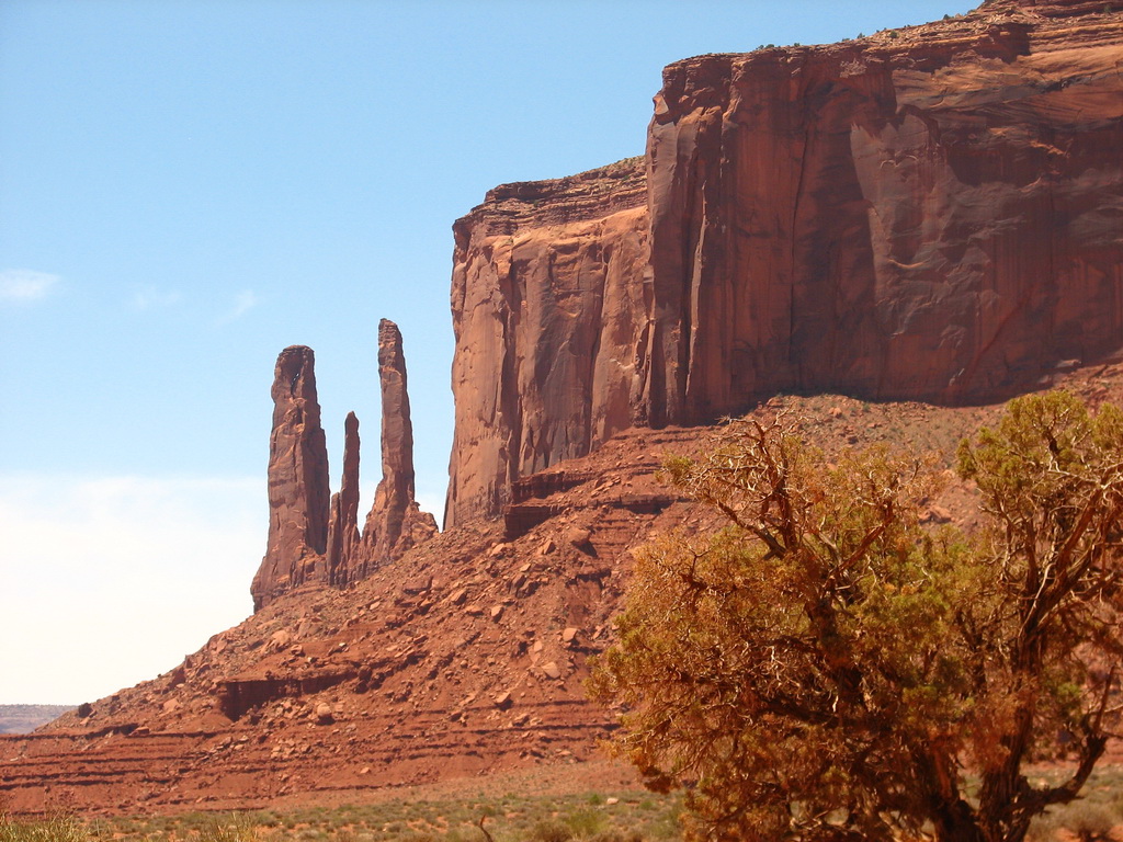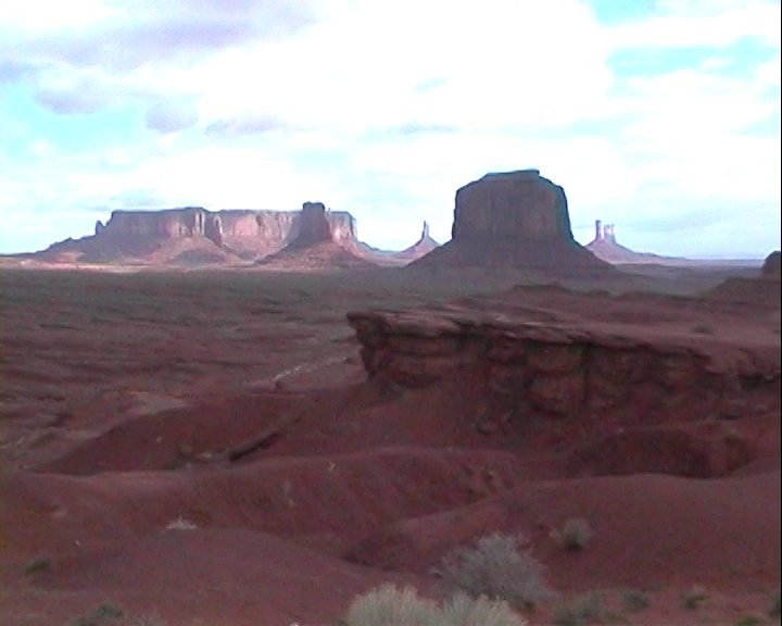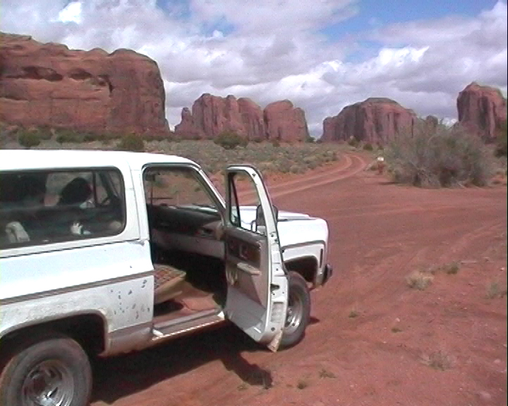 Notre guide navajo commence la visite et nous explique les différents noms donnés aux "Mesas" (les grandes falaises de pierre) tels que Raingod Mesa, Mitchell Mesa, Thunderbird Mesa, ... ou aux "Buttes" (les pitons rocheux esseulés) tels que Mitchell Butte, Big Indian, The King on his Throne, Three Sisters, Elephant Butte ...