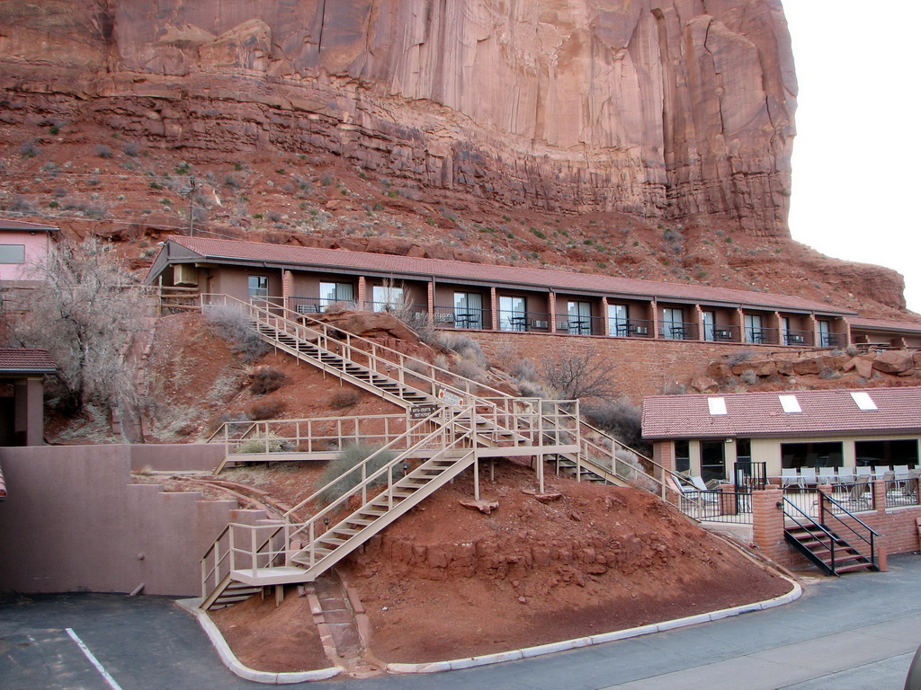 Sur la route, nous découvrons une nouvelle fois un décor extraordinaire constitué de gigantesques pitons rocheux posés au milieu de la plaine. La brume très basse et le ciel sombre donnent aux rochers une silhouette inquiétante et mystérieuse. Après un détour au Goulding's Lodge, seul hôtel se trouvant dans le parc de Monument Valley, nous retournons à notre hôtel. Diner au restaurant de l'hôtel, et retour à la chambre. Le temps est toujours aussi catastrophique (pluie et froid), ce qui ne laisse rien augurer de bon pour le lendemain.
